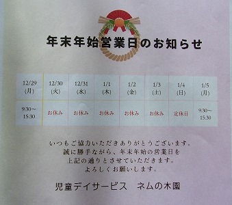 今年もあっという間に一年が過ぎたように感じています。日々の活動の中で地域の方や、家族様に支えていただきたくさんのご協力を頂きましたことを心より感謝申し上げます。この一年で色々な体験を通してたくさんの事を学び子どもたちだけでなく...