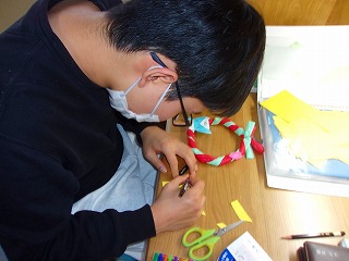 今年最後の製作に取り組みました。お正月に飾れるようにしめ縄リースを作りました。子どもたちが作りやすいようにリースを選び、折り紙で作った馬とミカンと梅の花を選び貼っていきました。色んな色のリースがあり悩んでいる子もいました。色ん...