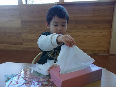 続いて、丸めたティッシュをカラーペーパーで包みます(๑•̀o•́๑)۶ FIGHT☆