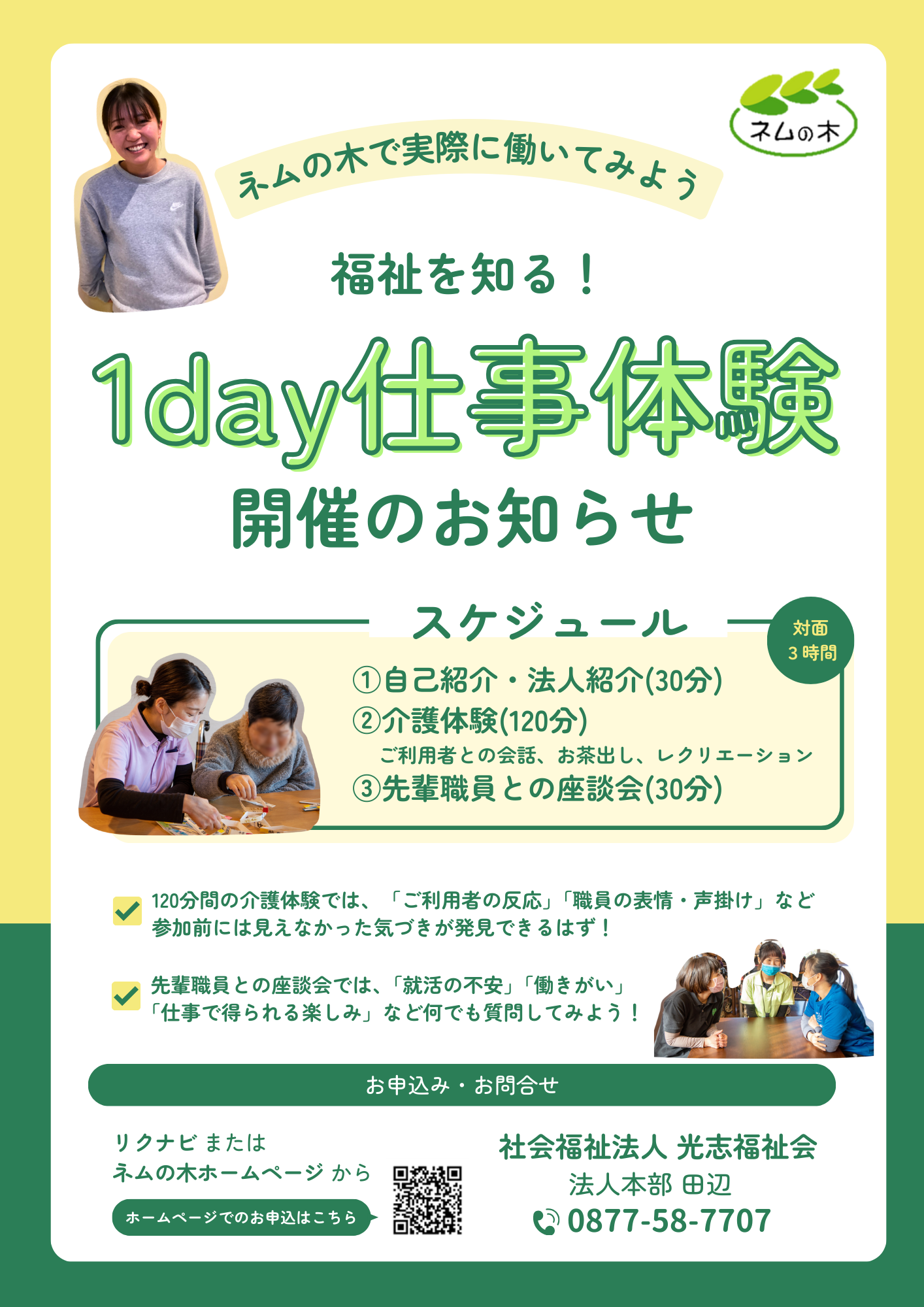 また、インターンシップは、介護体験などにより、自身の適性を再認識したり、介護職へ就職することを見つめ直す機会となります。ぜひご参加ください。