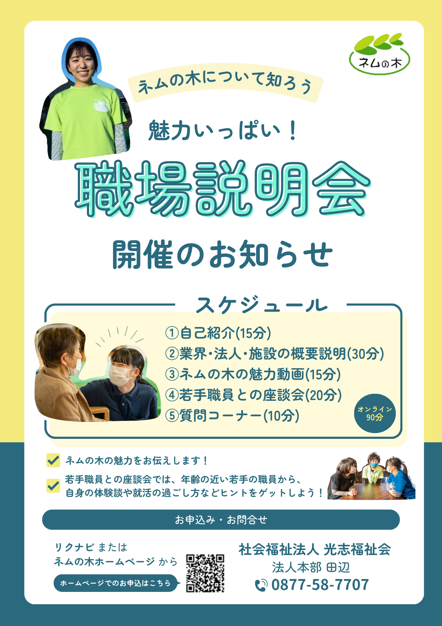 職場説明会は、若手の先輩職員から「業務のやりがい」「職場の実情」「介護職への就職を決めた理由」「これから進路を決める学生へのアドバイス」など生の声を直接聞ける貴重な機会です。